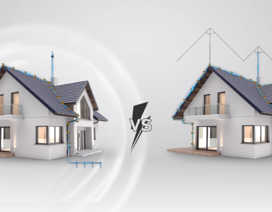 Пасивната (конвенционална) система разчита на мълниеприемници/мрежа и повече проводници по покрива, като често изисква по-голям обем монтаж. Активната система се базира на централен мълниеприемник и може да намали видимите елементи по покрива при определени обекти. Изборът се прави след оглед и съобразяване с конструкцията, рисковете и нормативните изисквания.
